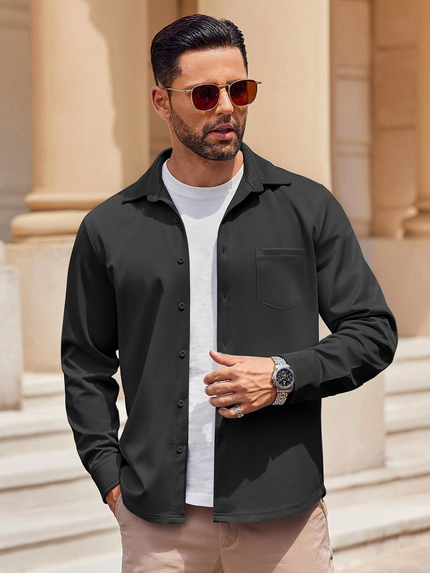 1pc Men'S Casual Long Sleeve Button-Down Shirt with Pocket - Wrinkle Free Polyester, Solid Color, Suitable for All Seasons, Plus Size 1pc Men'S Casual Long Sleeve Button-Down Shirt with Pocket - Wrinkle Free Polyester, Solid Color, Suitable for All Seasons, Plus Size