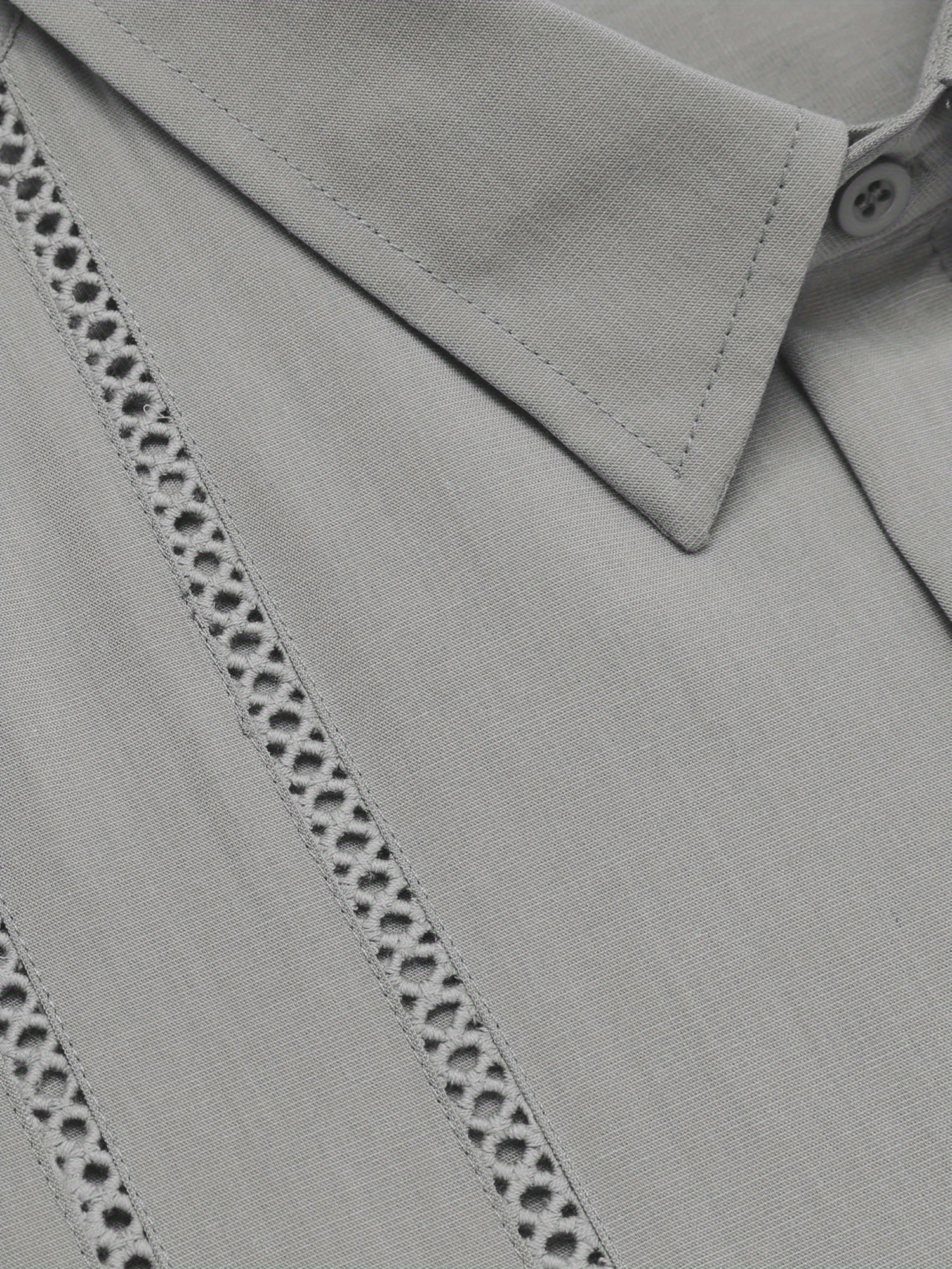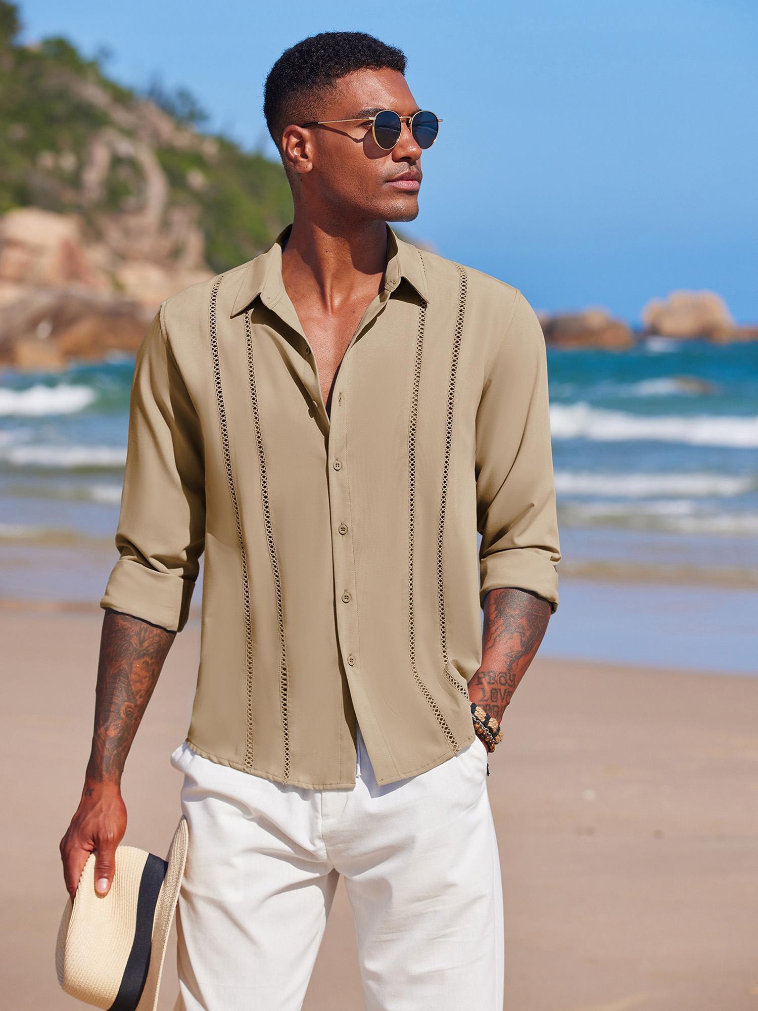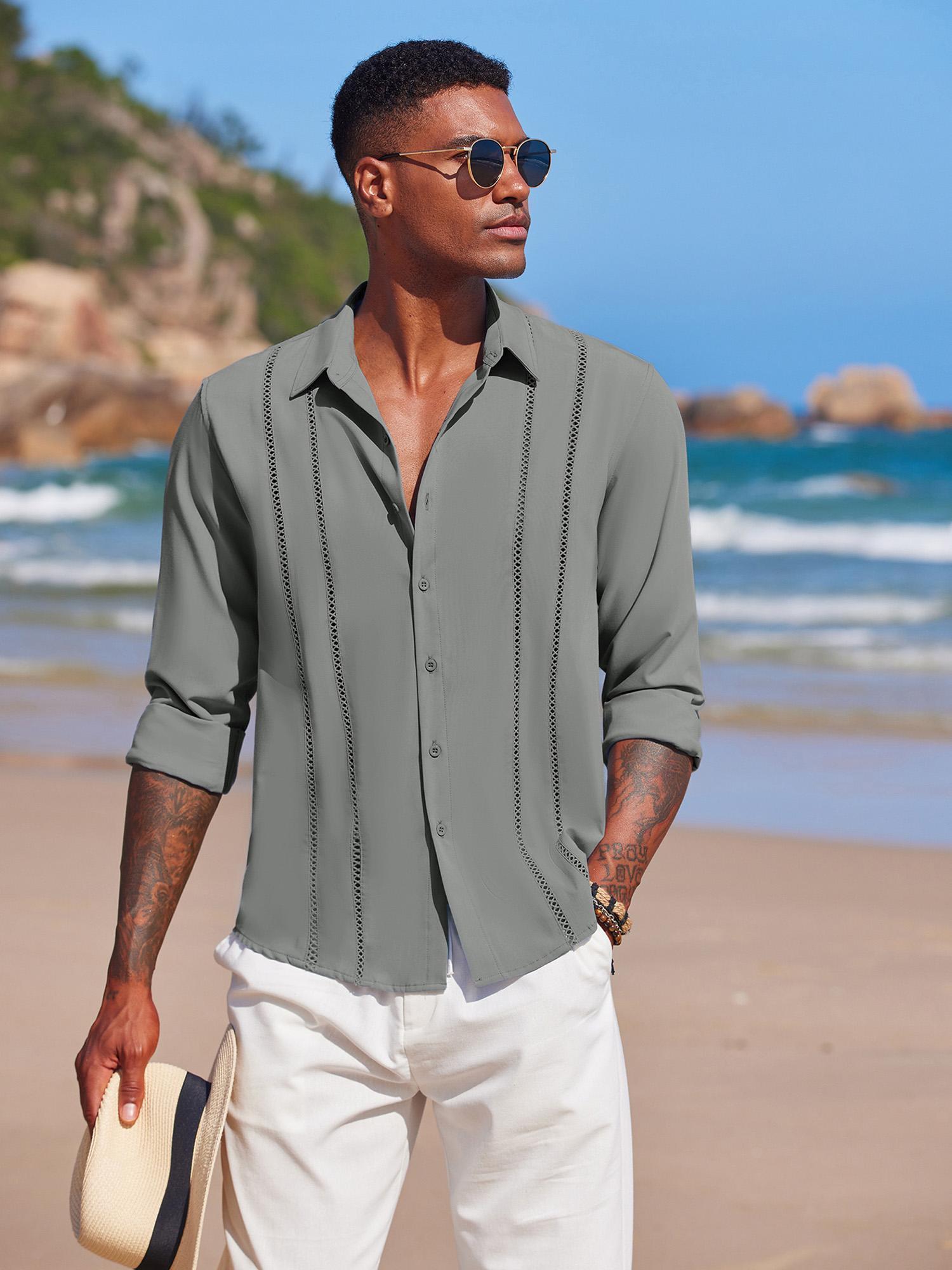 • Men'S Cuban Guayabera Long Sleeve Shirt - Casual Woven Linen Beach Shirt, Regular Fit, Button Down, Non-Stretch Polyester Fabric, Solid Color, Appropriate for Adult Men, Spring/Fall Season Essentials, Plus Size