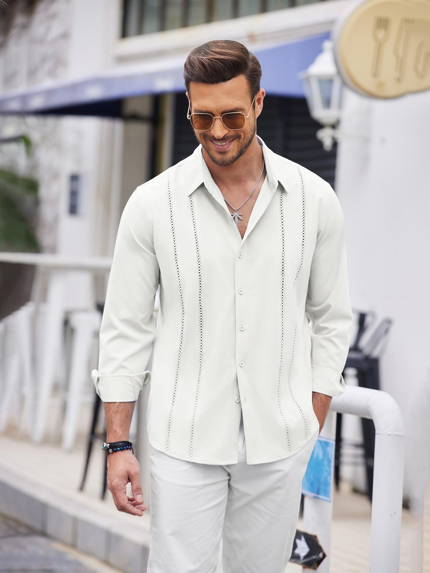 Men'S Cuban Guayabera Long Sleeve Shirt - Casual Woven Linen Beach Shirt, Regular Fit, Button Down, Non-Stretch Polyester Fabric, Solid Color, Appropriate for Adult Men, Spring/Fall Season Essentials, Plus Size
