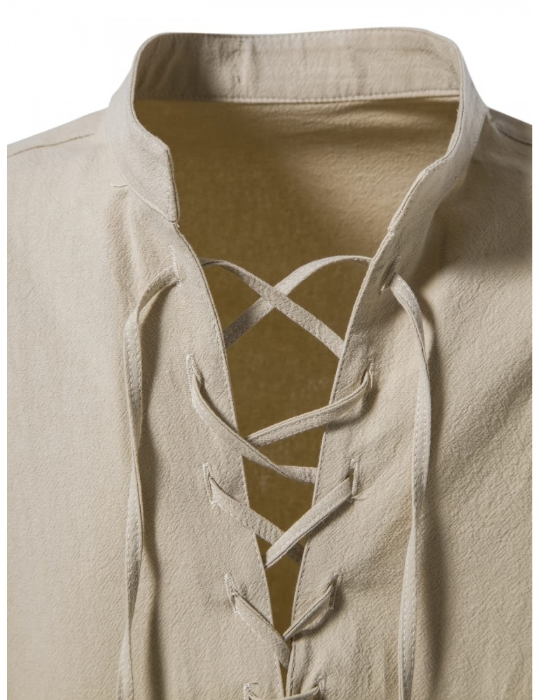 Medieval Pirate Shirt - Long Sleeve Retro Renaissance Solid Cotton V-Neck Tee with Lace Up Closure - Perfect for Halloween Festival Party Beach Casual Wear