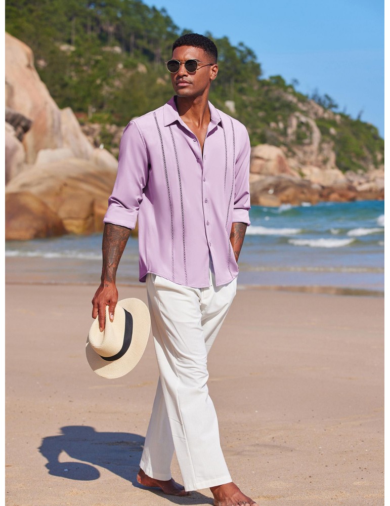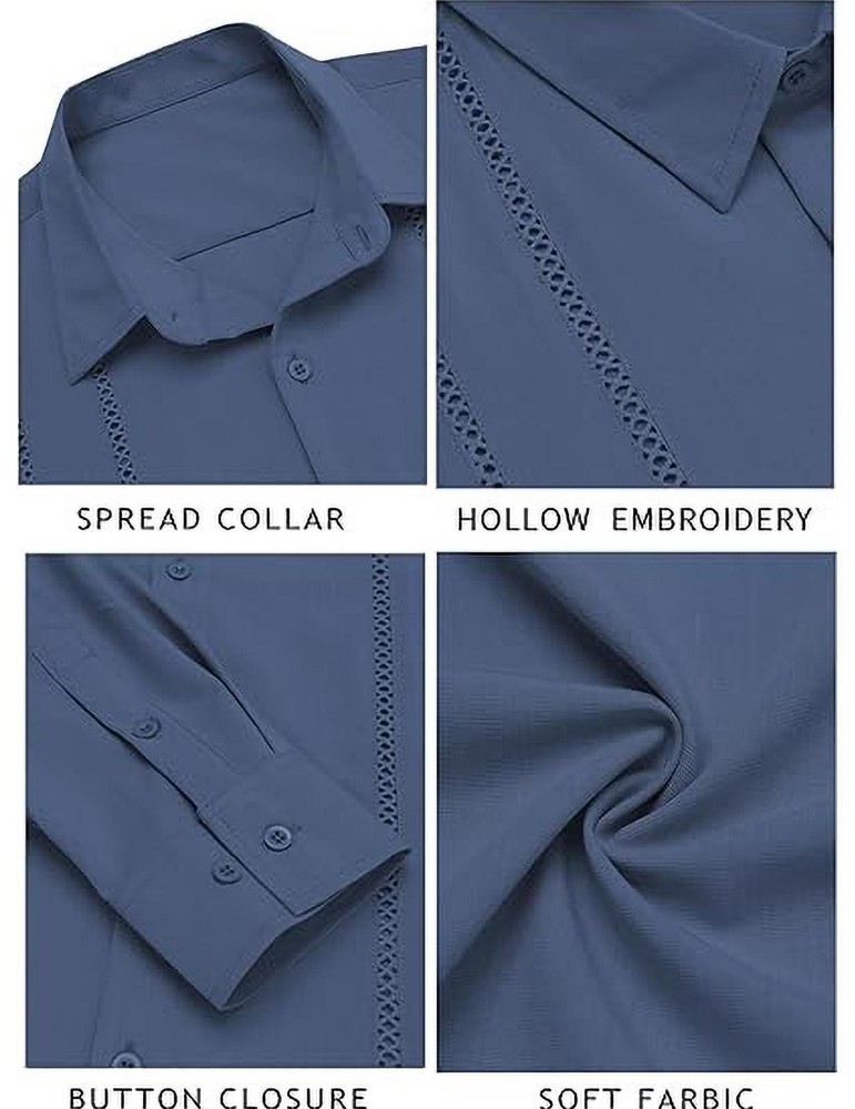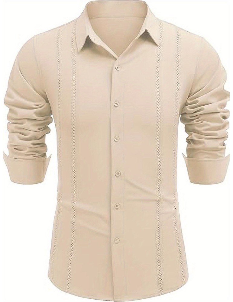 • Men'S Cuban Guayabera Long Sleeve Shirt - Casual Woven Linen Beach Shirt, Regular Fit, Button Down, Non-Stretch Polyester Fabric, Solid Color, Appropriate for Adult Men, Spring/Fall Season Essentials, Plus Size