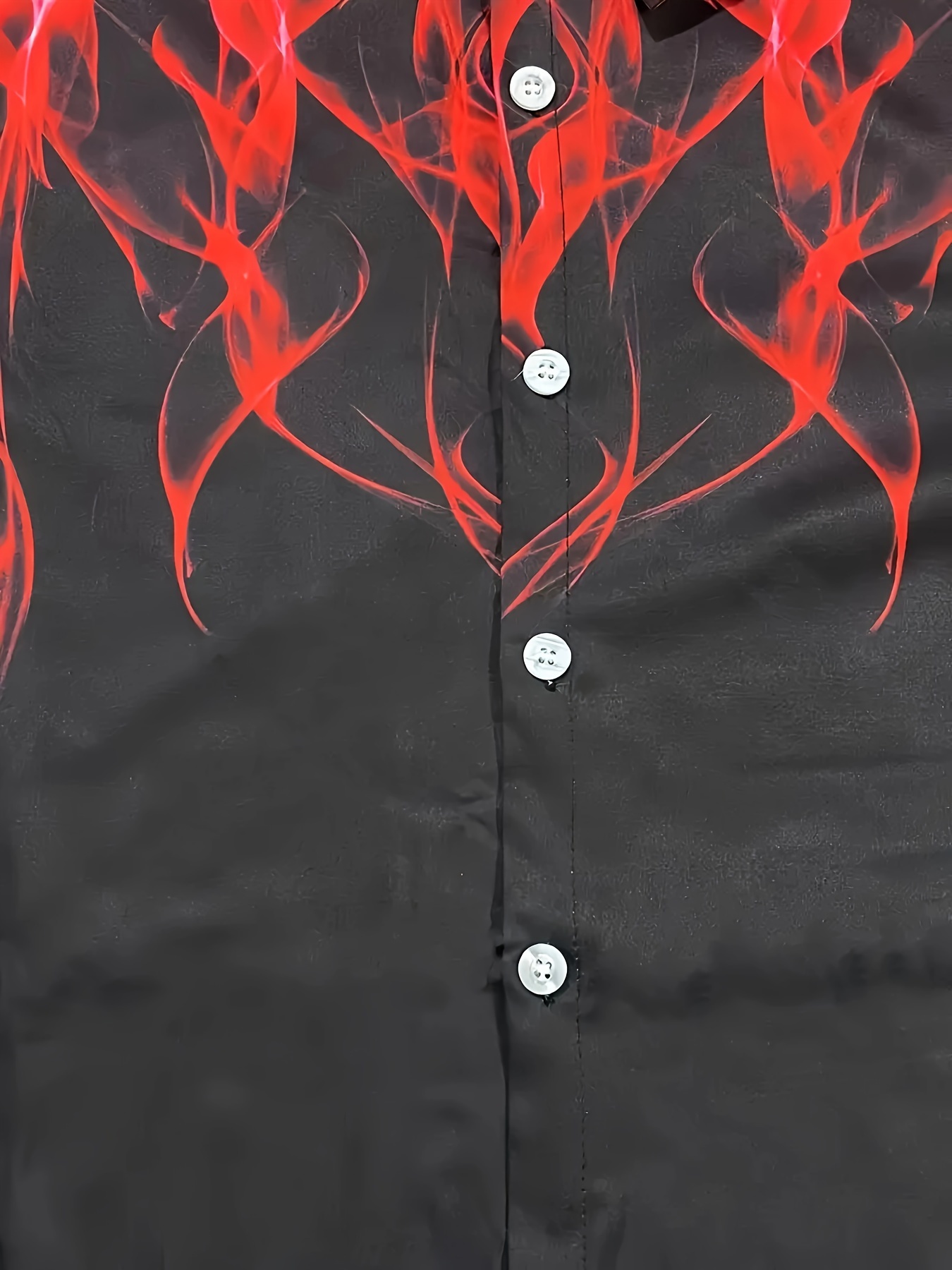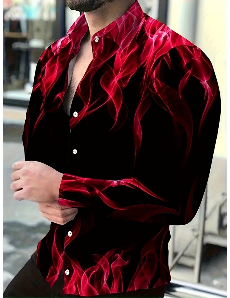 • Plus Size Men's Long Sleeve Shirt With Flame Print, Comfortable Breathable And Versatile For Spring/Fall
