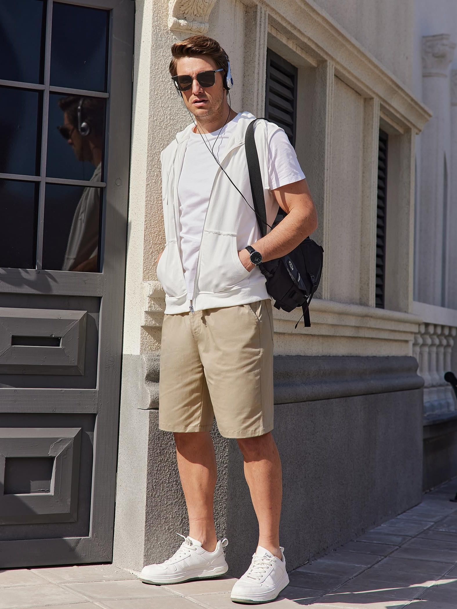 • 1pc Men'S Casual Cotton Shorts with Slight Stretch - Solid Color, Loose Fit, Woven Golf Shorts with Pockets and Drawstring - Summer Beach Chino Shorts with Belt Loops