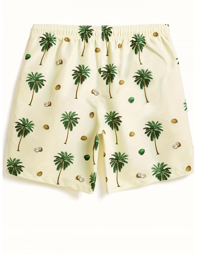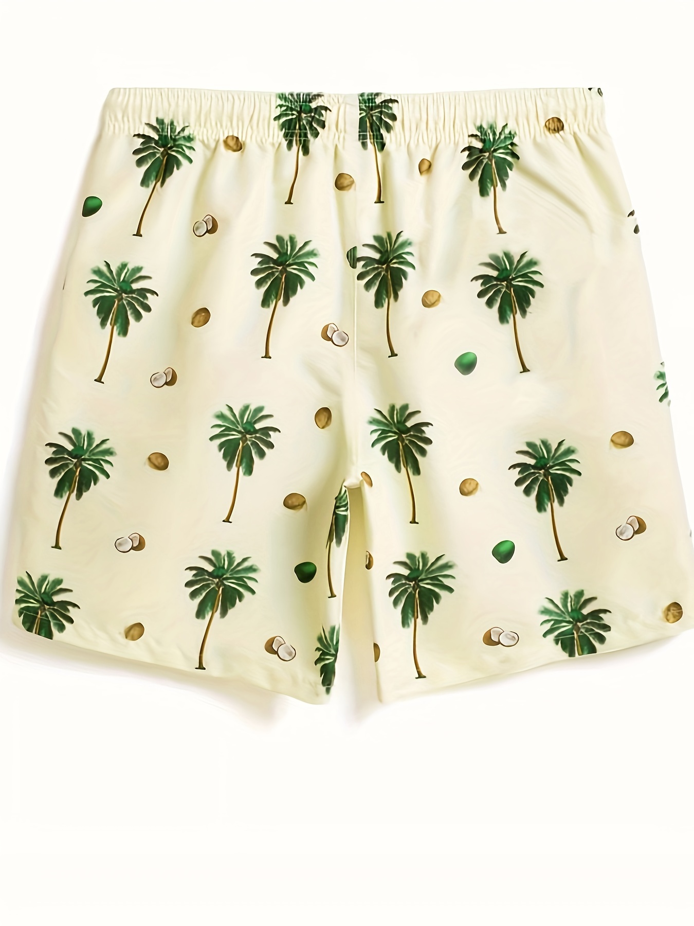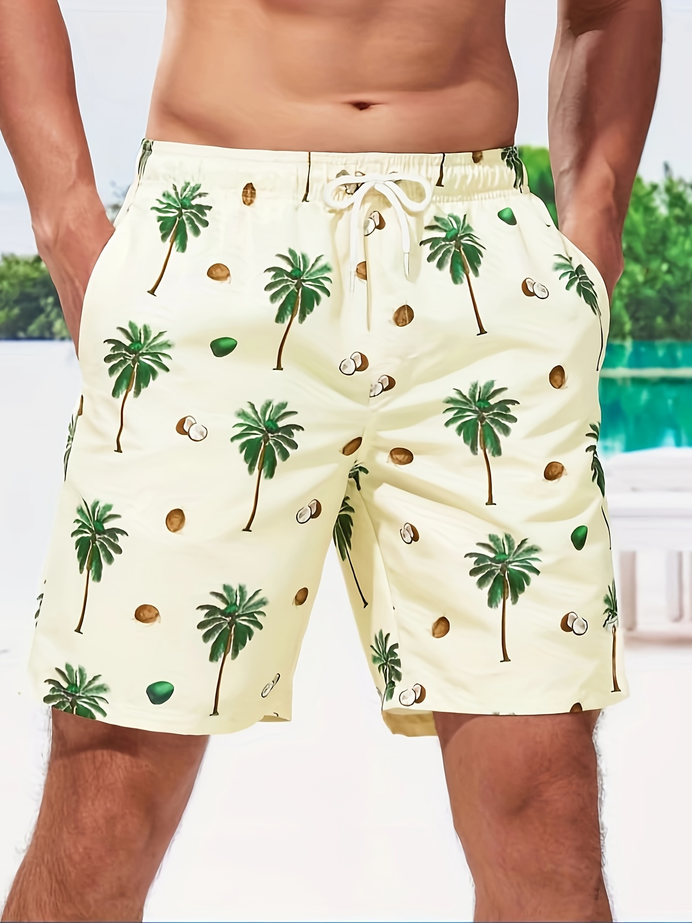 • Men's Casual Coconut Palm Print Active Shorts, Drawstring Beach Shorts For Summer Beach Resort