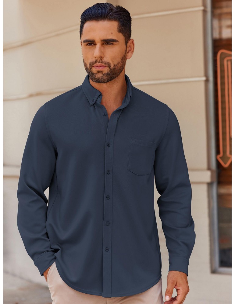 Men's Wrinkle-Free Long Sleeve Shirt - Casual Button-Down with Pocket, Stretch Fabric, Machine Washable, PLUS SIZE