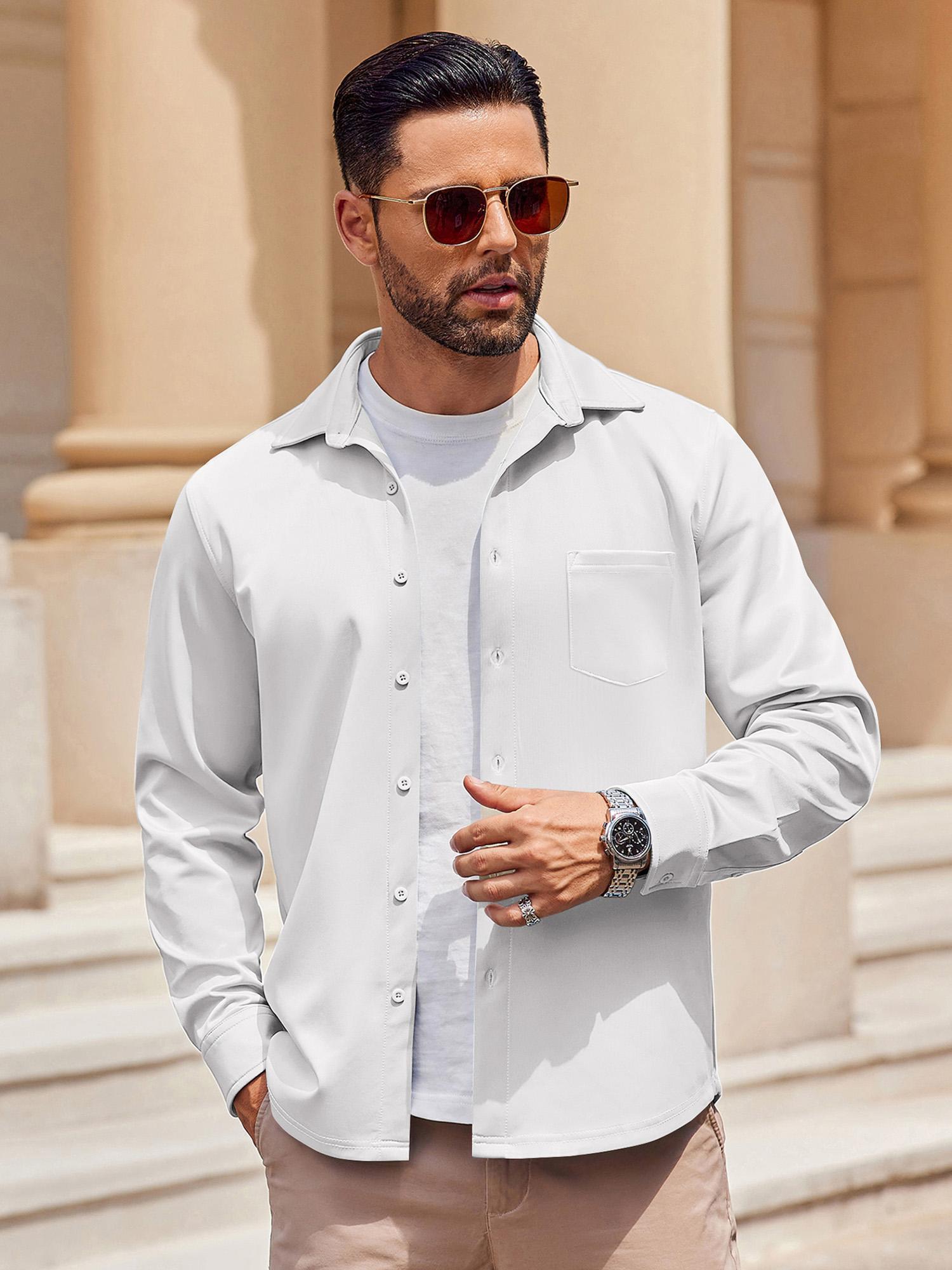 Men's Wrinkle-Free Long Sleeve Shirt - Casual Button-Down with Pocket, Stretch Fabric, Machine Washable, PLUS SIZE