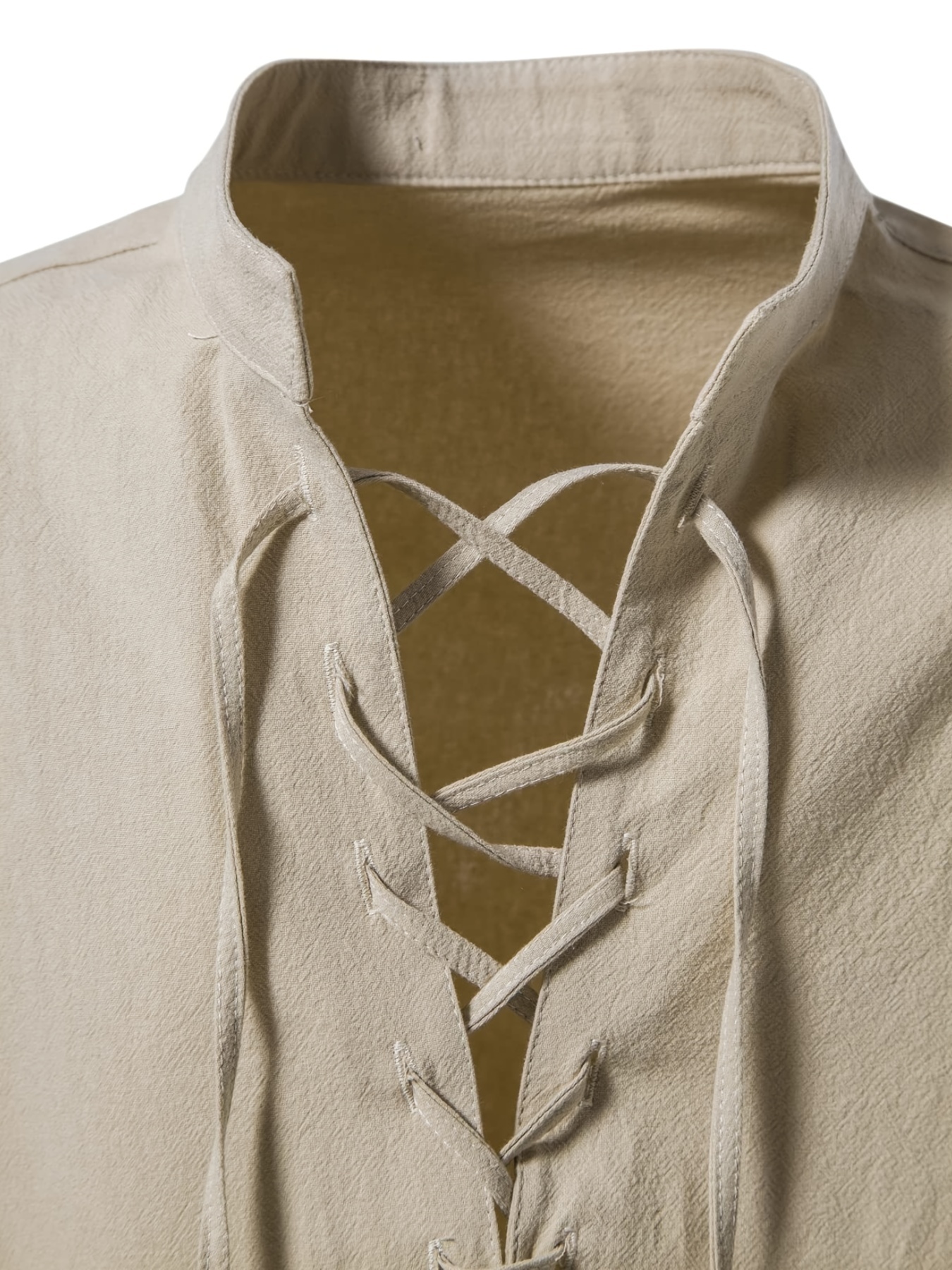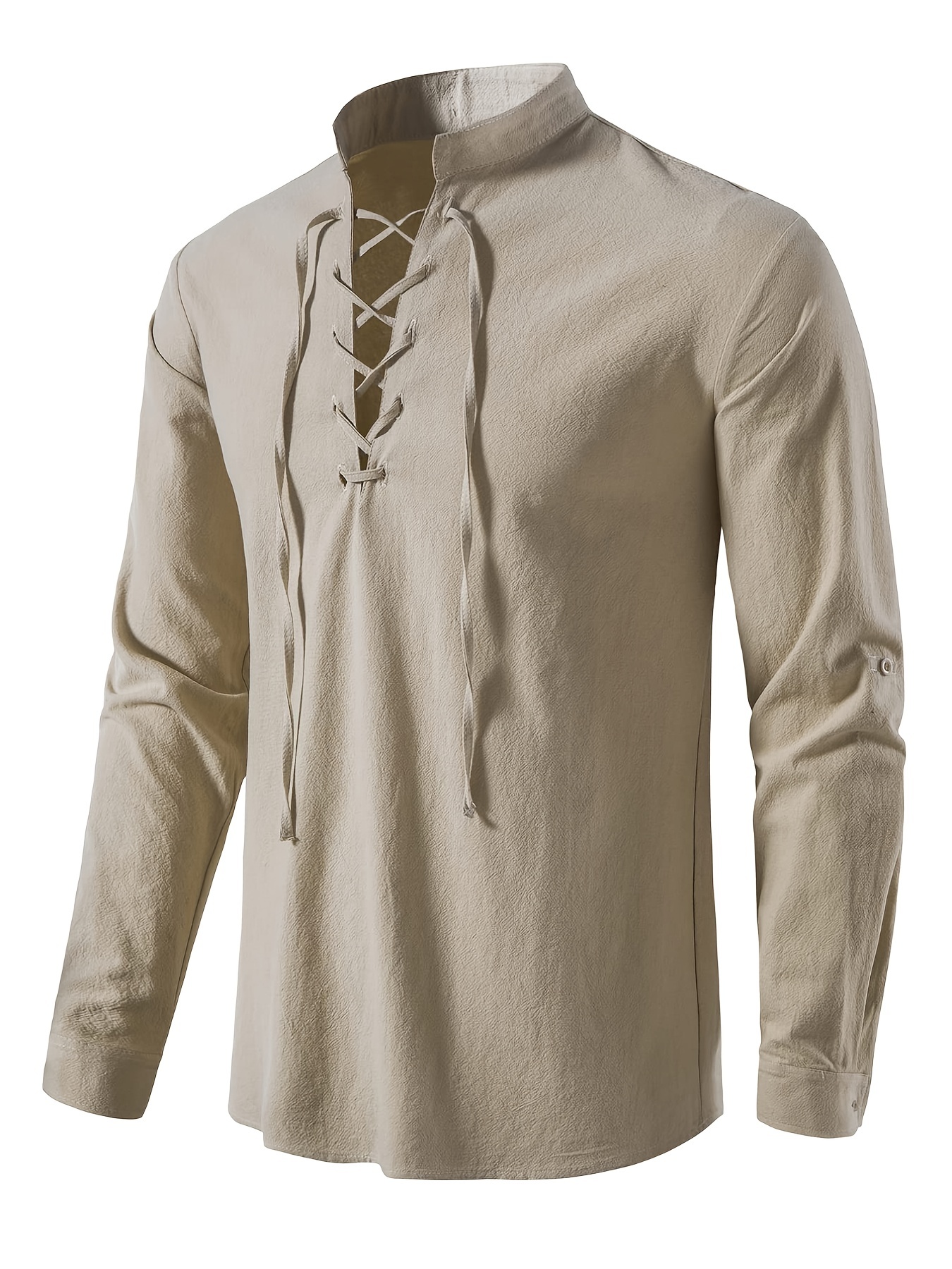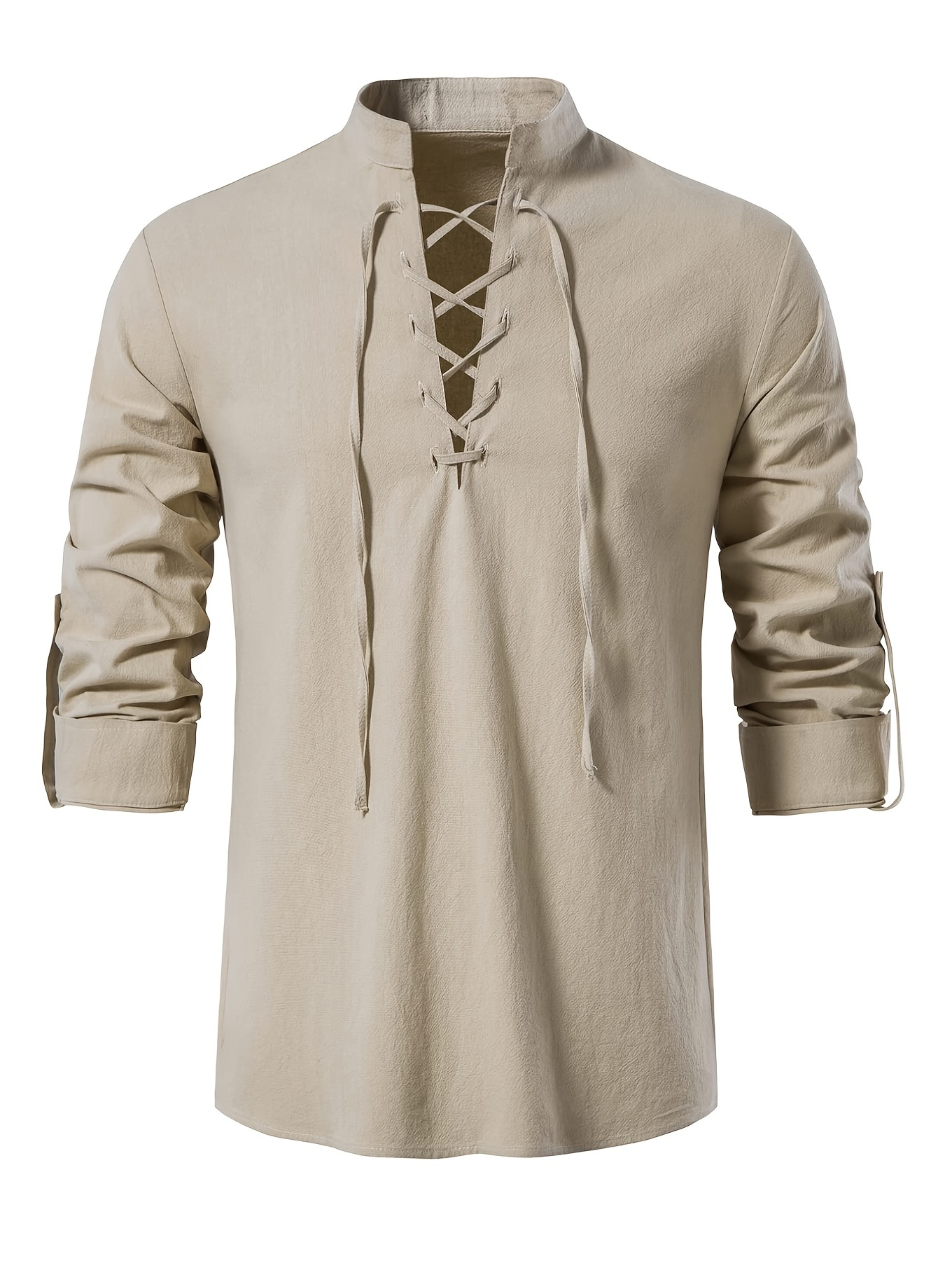 Medieval Pirate Shirt - Long Sleeve Retro Renaissance Solid Cotton V-Neck Tee with Lace Up Closure - Perfect for Halloween Festival Party Beach Casual Wear