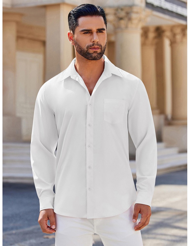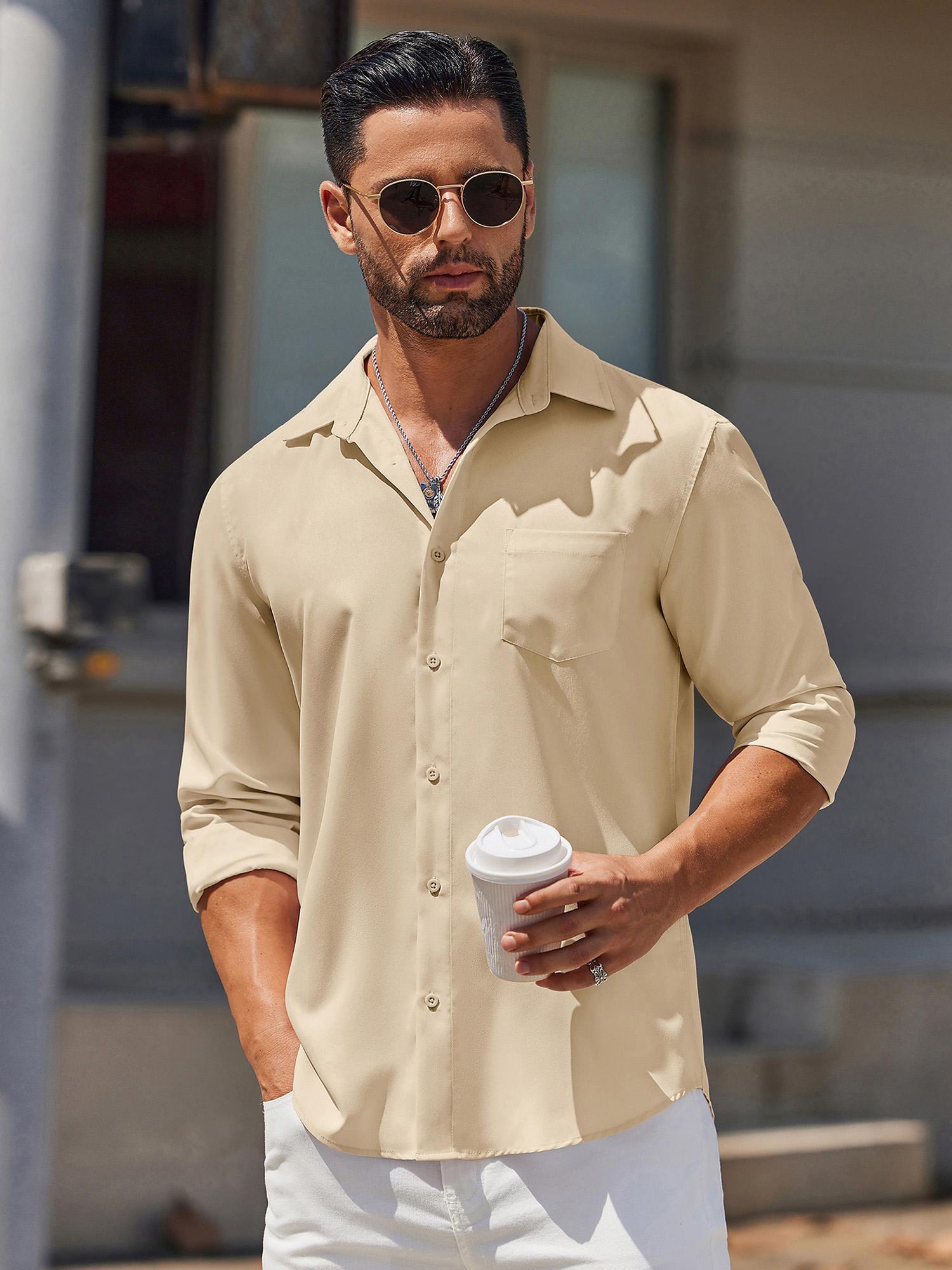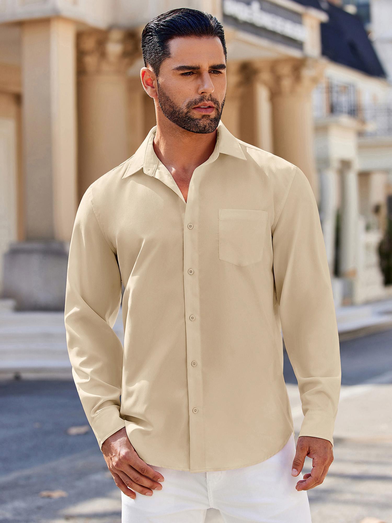 • Men's Classic Long Sleeve Button-Down Shirt - Casual & Formal, Solid Color, Polyester, Perfect for Beach Weddings & Spring/Fall, PLUS SIZE