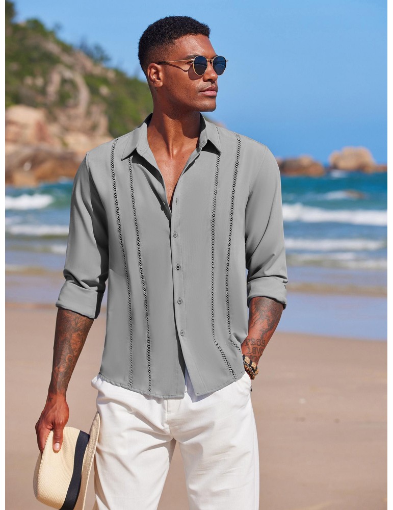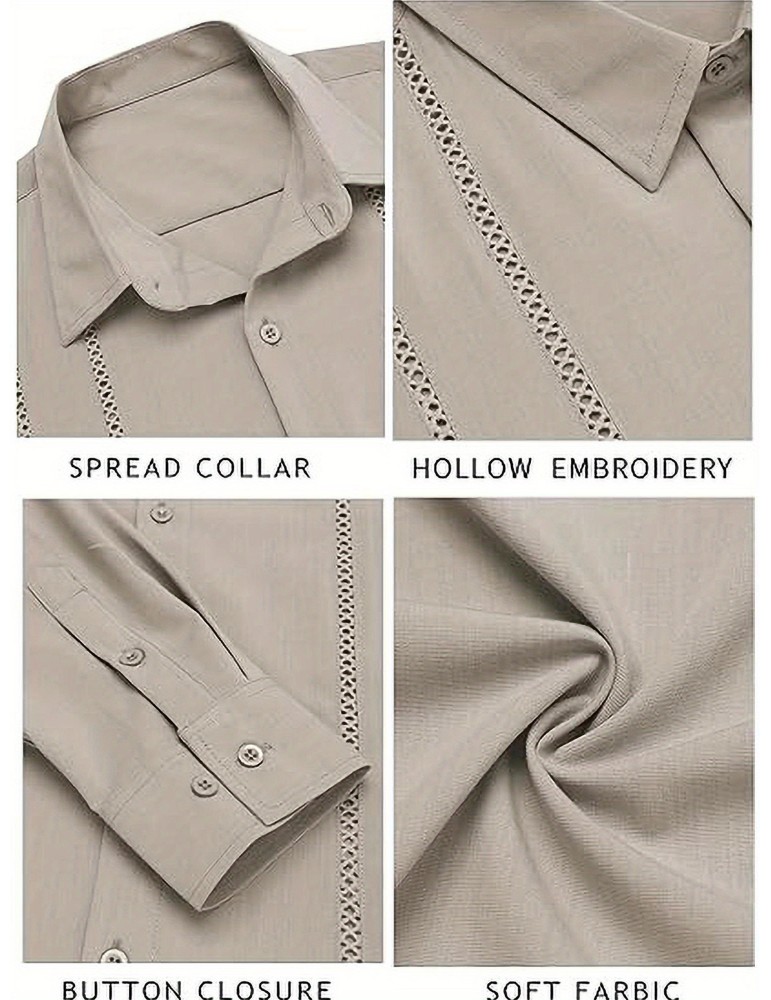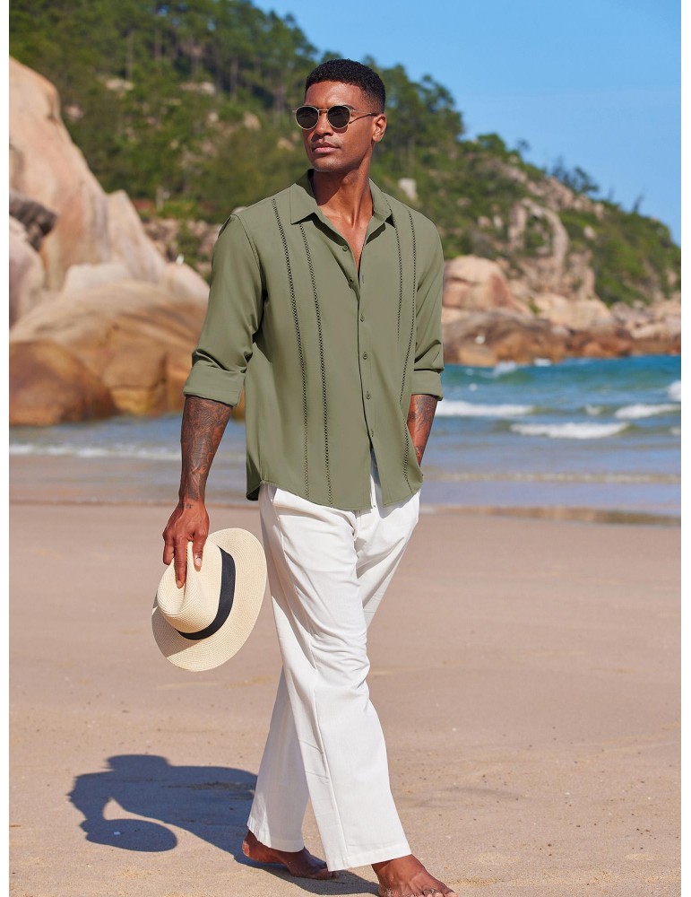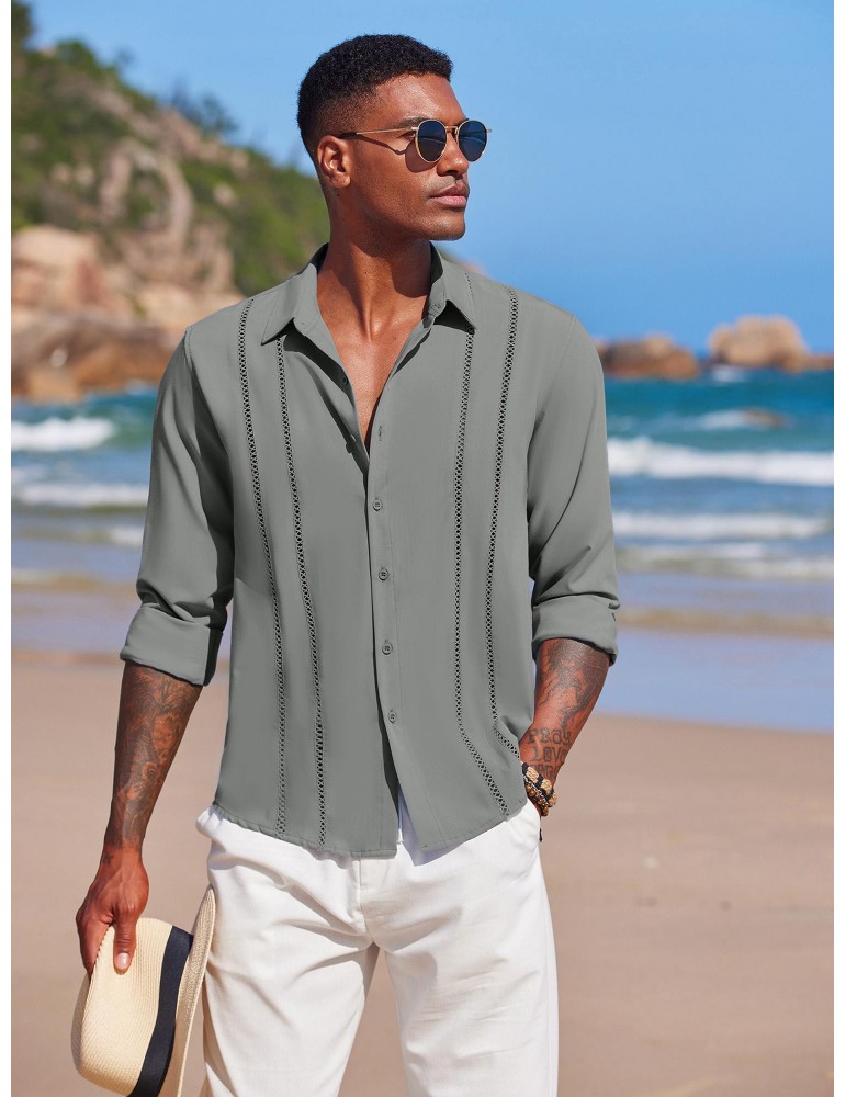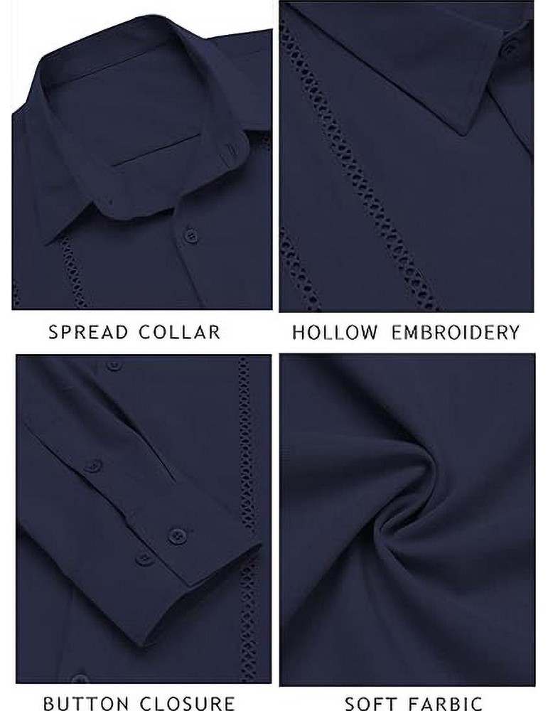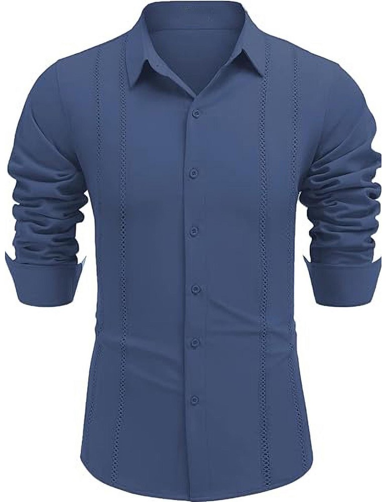 • Men'S Cuban Guayabera Long Sleeve Shirt - Casual Woven Linen Beach Shirt, Regular Fit, Button Down, Non-Stretch Polyester Fabric, Solid Color, Appropriate for Adult Men, Spring/Fall Season Essentials, Plus Size