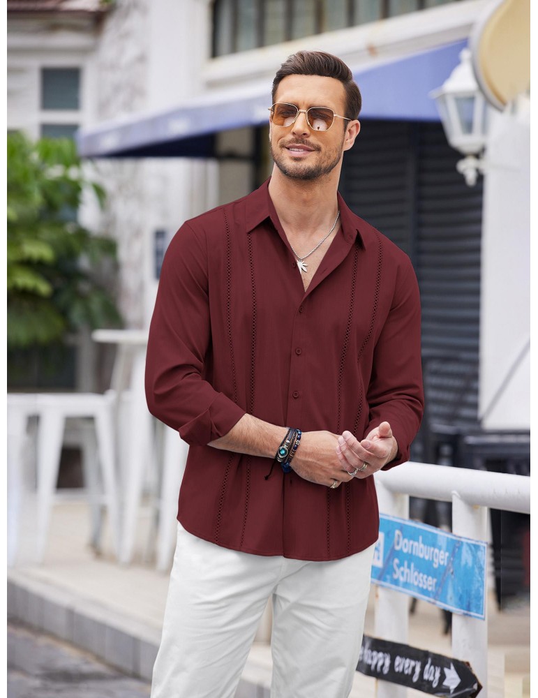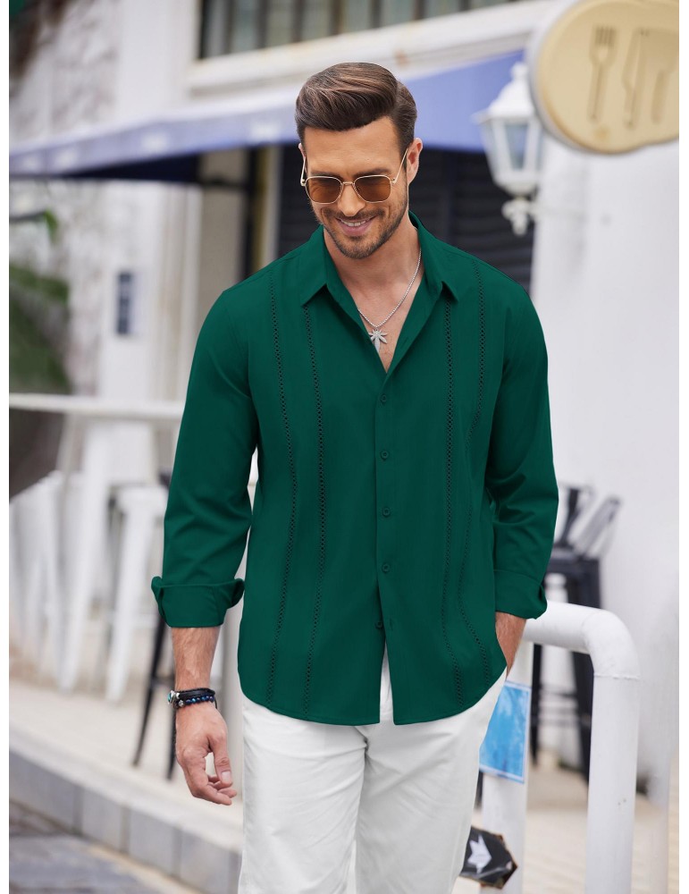 Men'S Cuban Guayabera Long Sleeve Shirt - Casual Woven Linen Beach Shirt, Regular Fit, Button Down, Non-Stretch Polyester Fabric, Solid Color, Appropriate for Adult Men, Spring/Fall Season Essentials, Plus Size