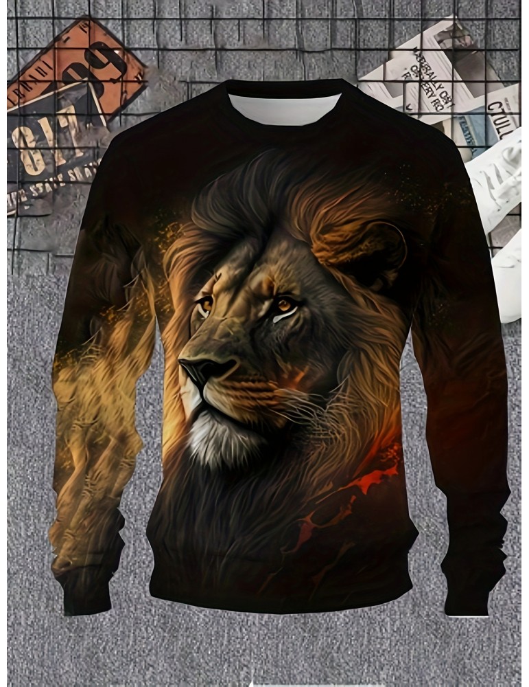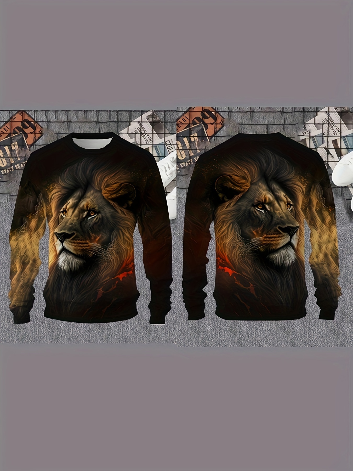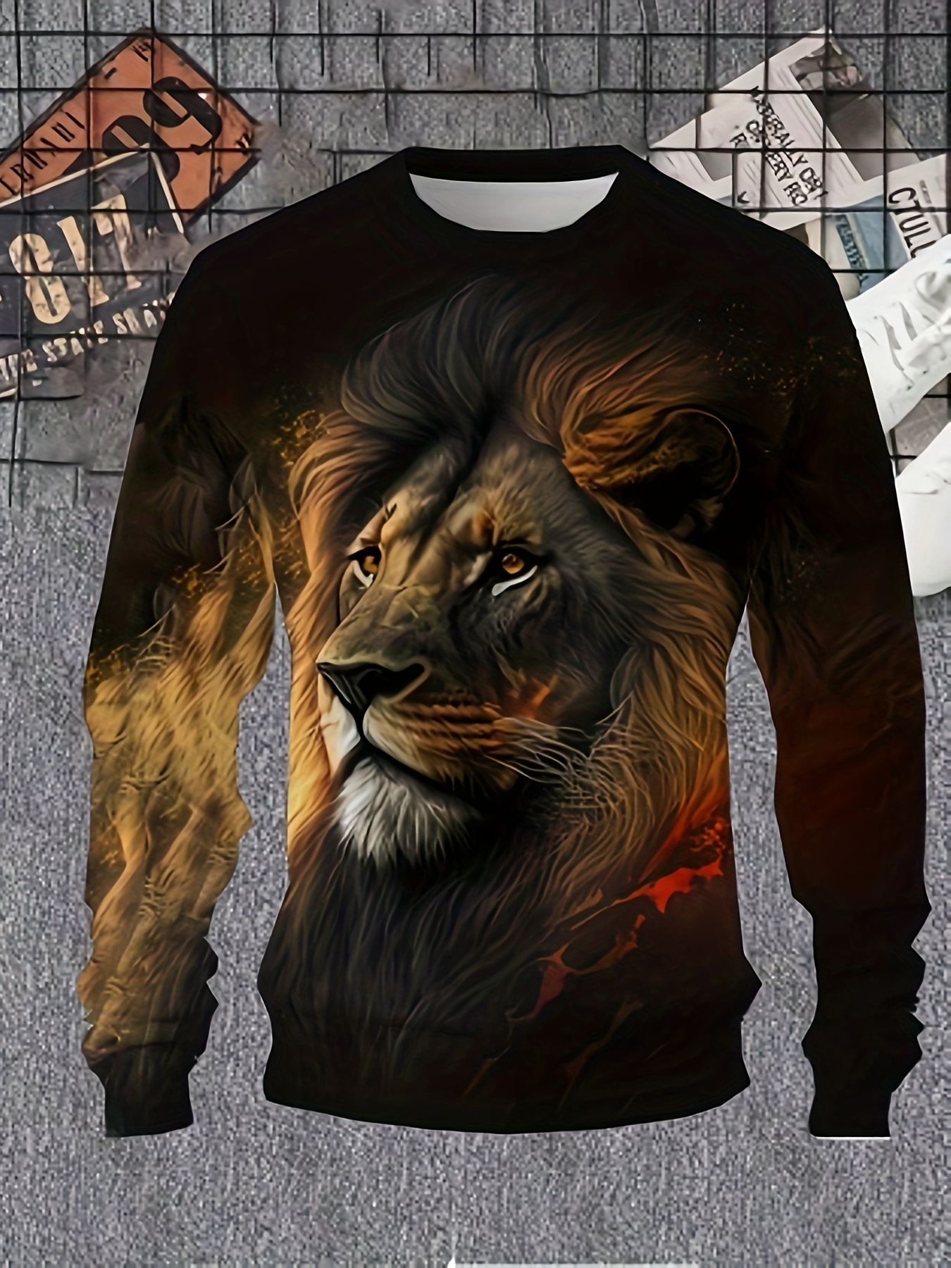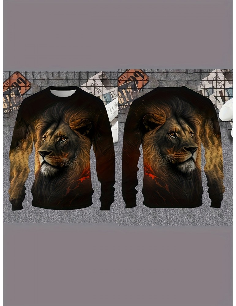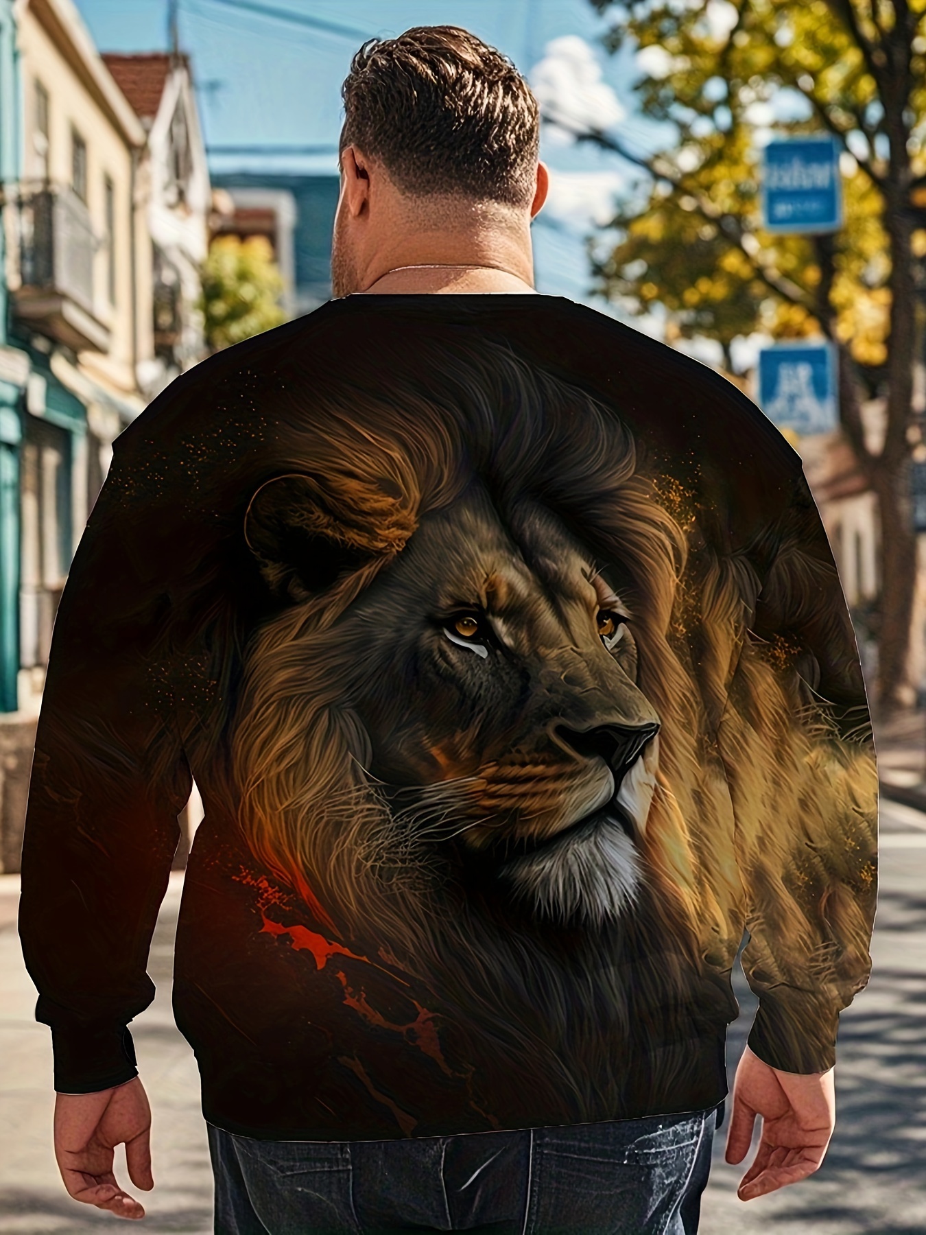 • Men'S Plus Size 3D Lion Head Print Sweatshirt, Casual Stretch Knit Top, Round Neck, Regular Fit, Polyester, Animal Print, Sports Style, Autumn/Winter Fashion