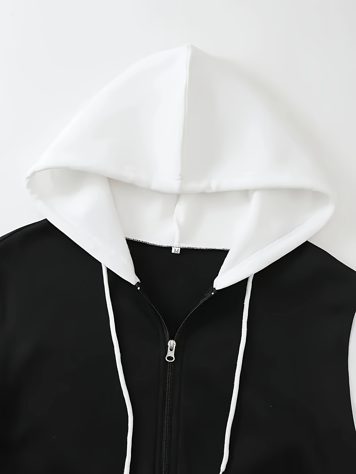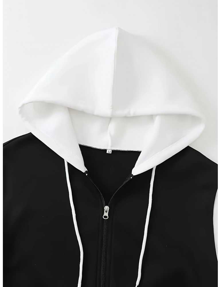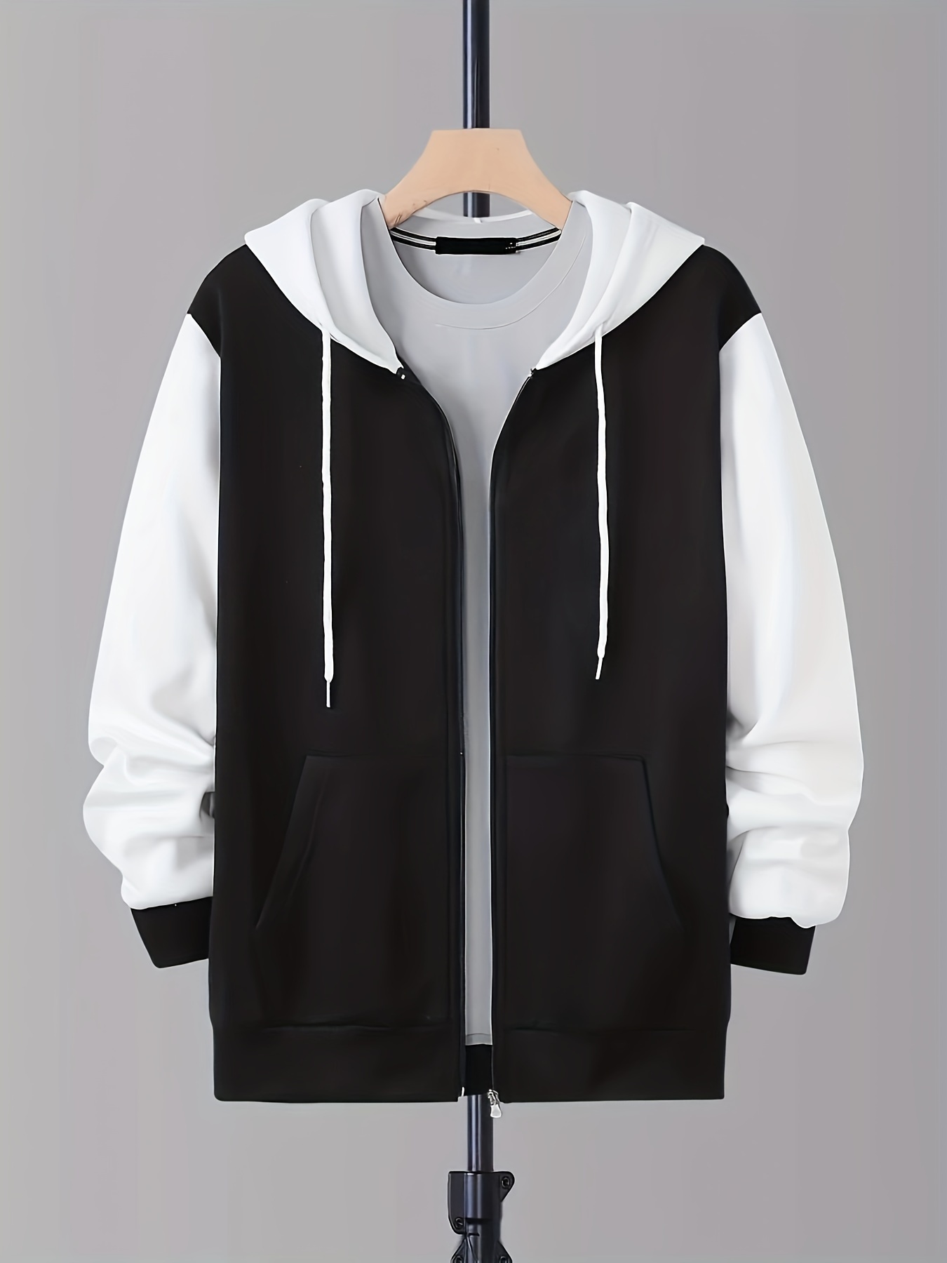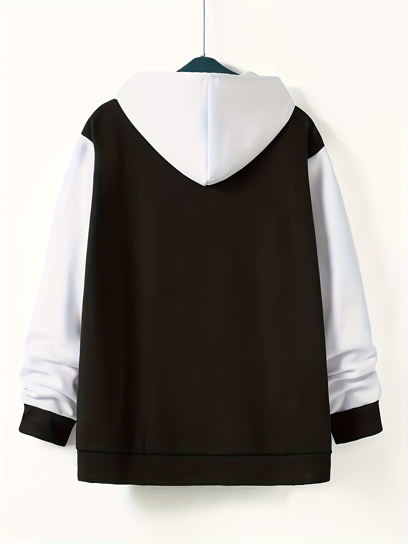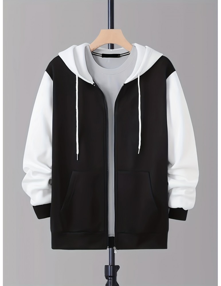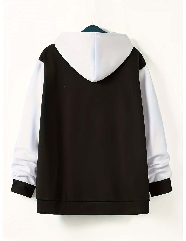Plus Size Mens Hooded Color Block Sweatshirt - Soft Slight Stretch Polyester Fabric, Loose Fit, Long Sleeves, Casual Sports Zip-Up Jacket with Pockets - Hand Wash or Dry Clean, Suitable for All Seasons and Couples Wear